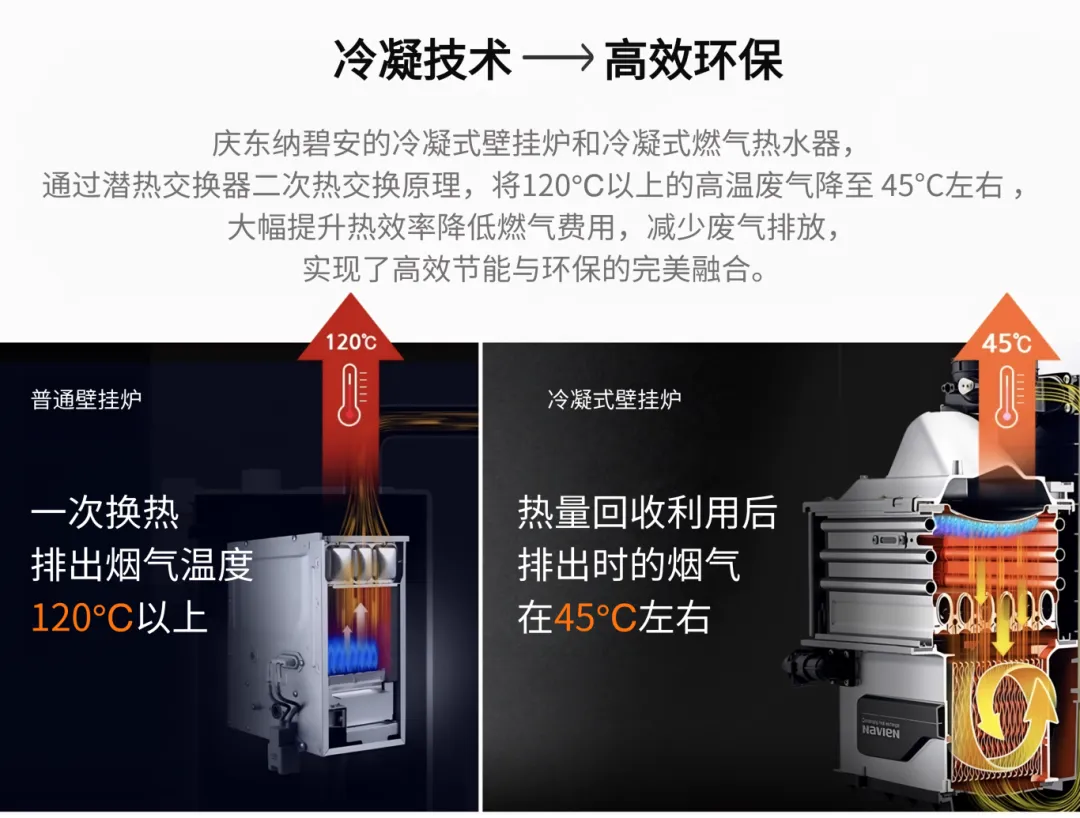 1988年,亚洲首款冷凝式燃气壁挂炉问世,庆东纳碧安率先将冷凝技术引入家用供暖领域。冷凝技术的核心价值,在于对燃烧过程中产生的废热进行二次回收,极大提高了能源利用率,降低了碳排放,真正实现了“节能+环保”双轮驱动。