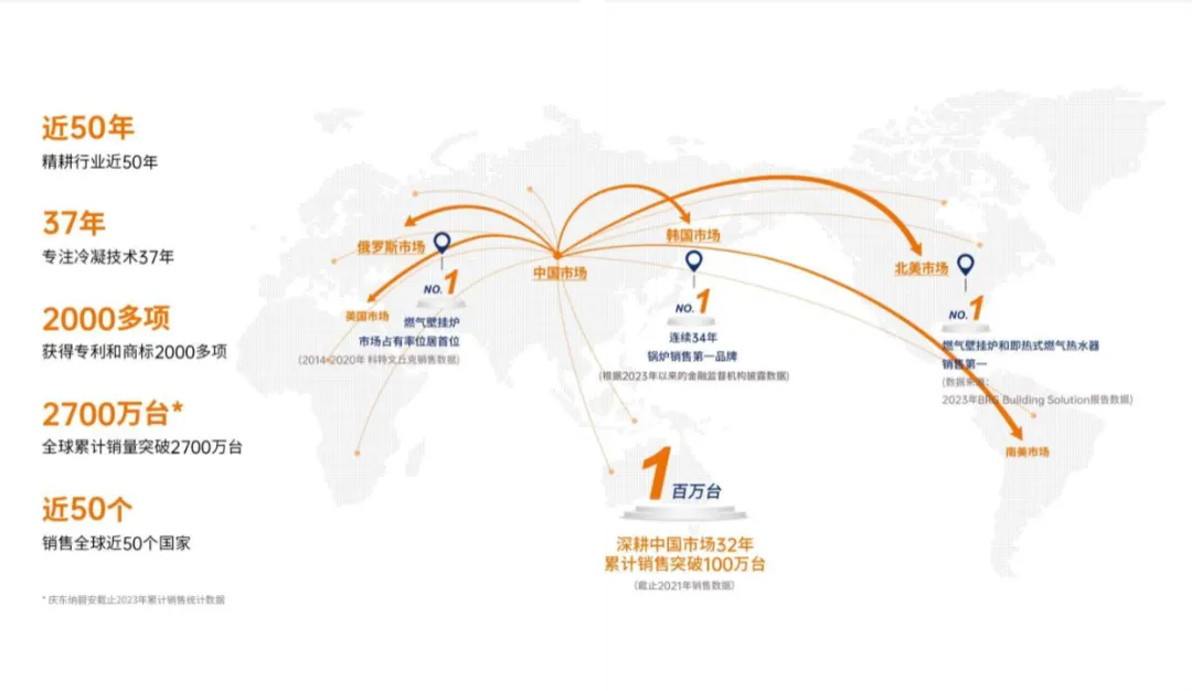 冷凝技术的每一次升级,都推动庆东纳碧安走向更广阔的全球市场。 2008年,随着庆东集团相关产品在节能环境设备领域的拓展,美国、欧洲、俄罗斯等全球化市场的兴起,集团由“庆东锅炉”更名为“庆东纳碧安”,庆东为集团名称,纳碧安为品牌名称,寓意“能源效率与环境保护的领航者”。英文名KD Navien,寓意“Navigator(领航)、Energy(能源)、Environment(环境),全面开启全球化进程。 在北美市场,庆东纳碧安以高端冷凝产品赢得用户青睐。在俄罗斯,以稳定可靠的性能收获“国民级锅炉品牌”美誉。同时,品牌稳步进入英国、中亚、南美等多个市场,构建起覆盖全球的销售网络。