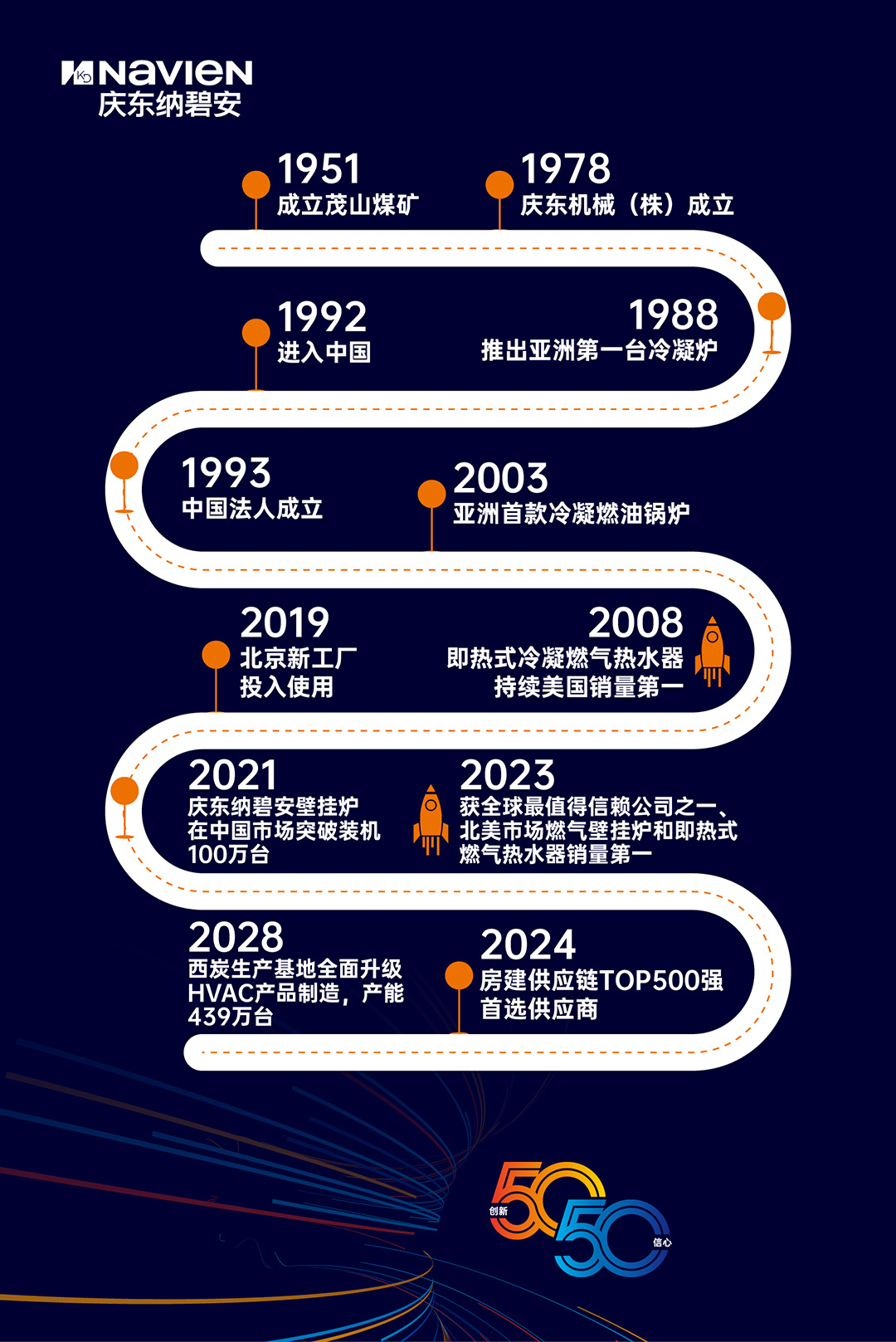 从1951年的茂山煤炭牌匾,到亚洲首款冷凝壁挂炉的诞生现场,从庆东纳碧安品牌更名,到中国工厂的奠基时刻,每一幅画面,都是时代洪流中的独特标记。