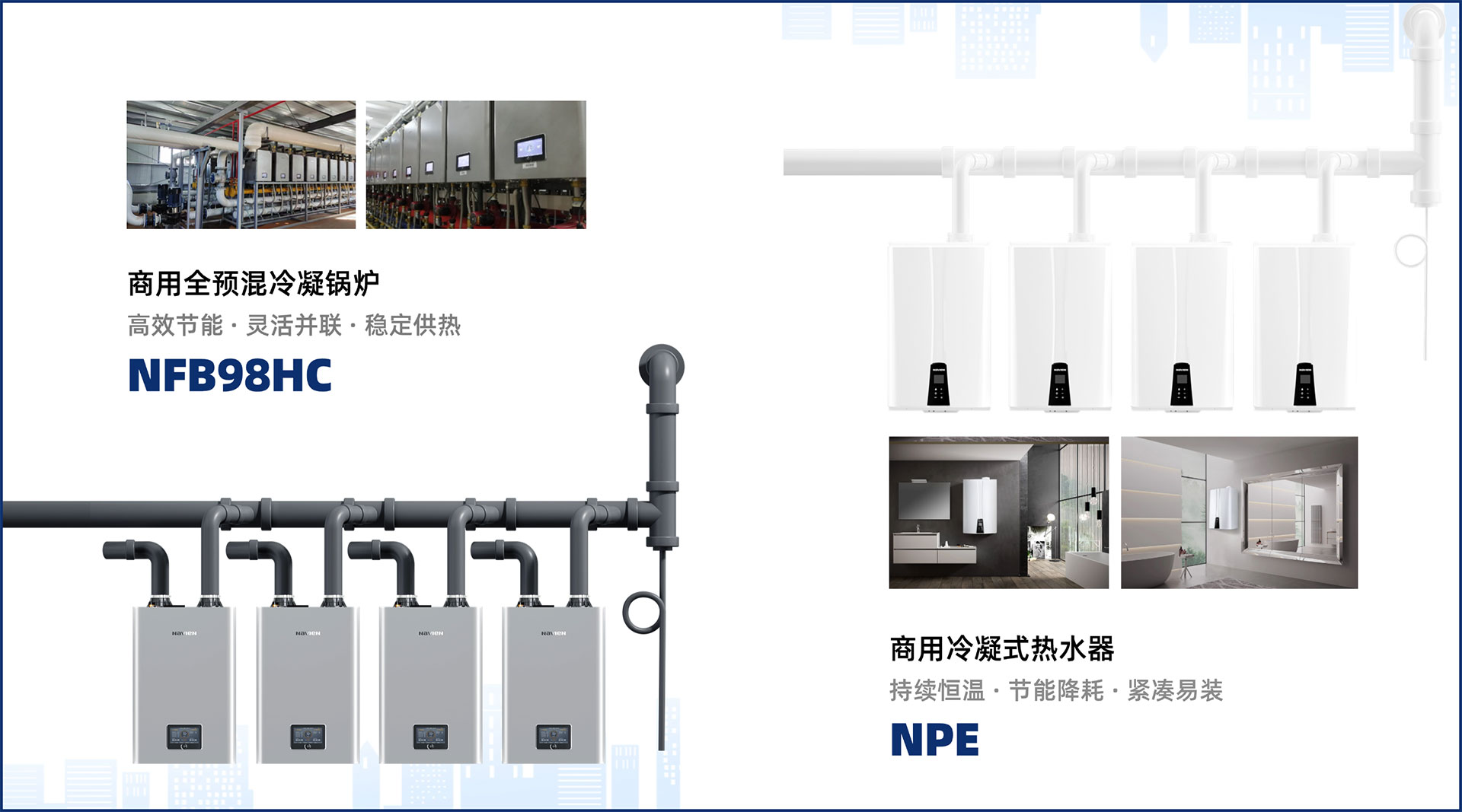 商用市场方面,NFB 98HC冷凝壁挂炉和NPE冷凝式mk网页版登录入口广泛应用于公共建筑与综合体。