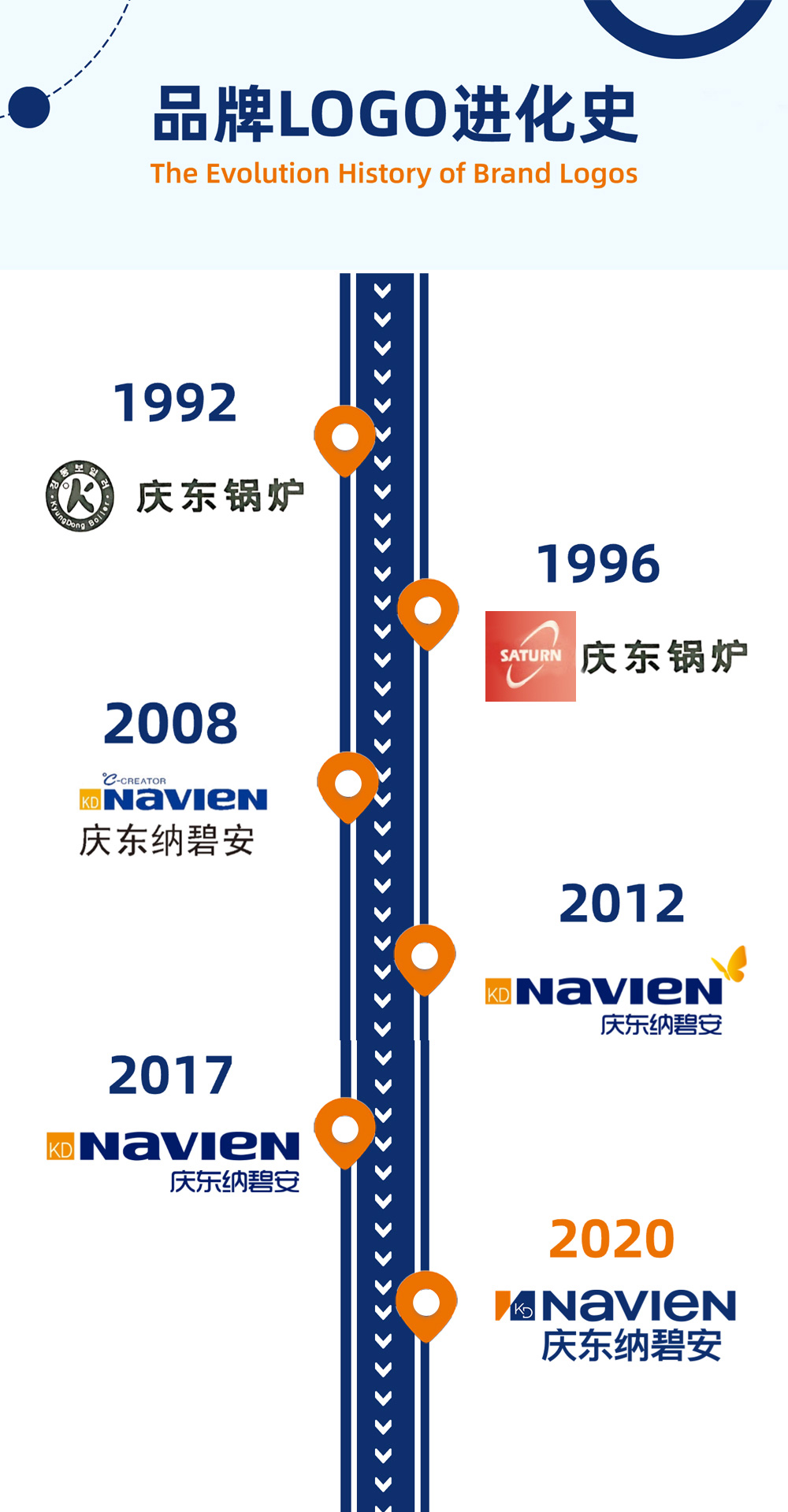 品牌印记|LOGO与产品的共成长在庆东纳碧安33年的中国旅程中,每一次产品的升级迭代,每一次品牌视觉的焕新,都是与时代和用户同频共振的注脚。从最初以韩文“경동”展示的品牌起点,历经6次演变“KD Navien”为代表的国际化识别系统,庆东纳碧安始终以专业、可信的形象,伴随用户进入每一个温暖时刻。